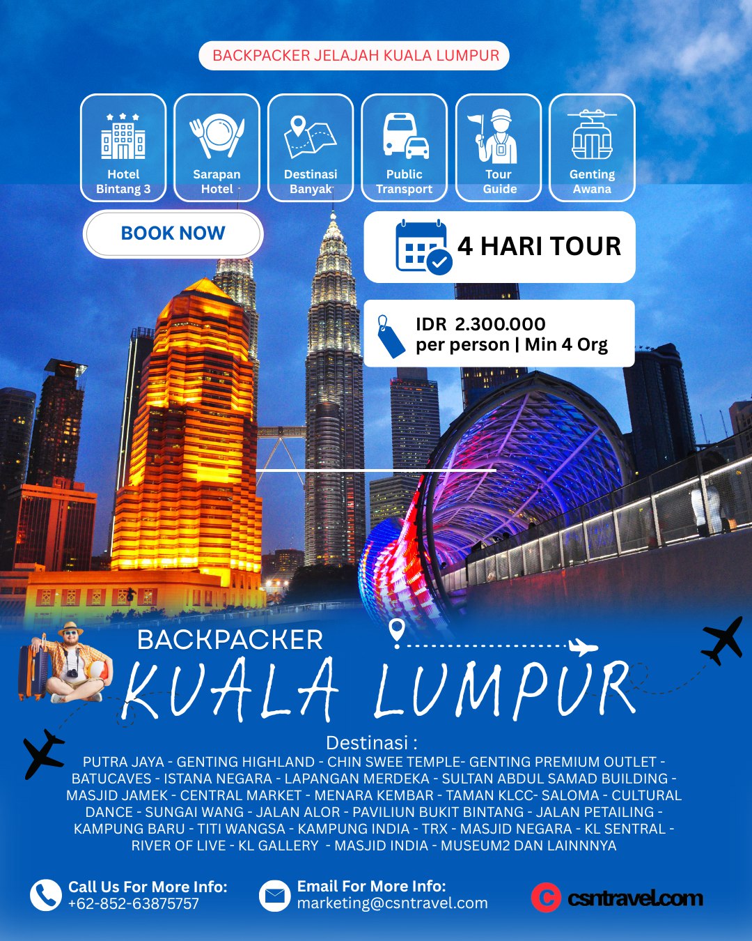 PUTRA JAYA – GENTING HIGHLAND – CHIN SWEE TEMPLE- GENTING PREMIUM OUTLET – BATUCAVES – ISTANA NEGARA – LAPANGAN MERDEKA – SULTAN ABDUL SAMAD BUILDING – MASJID JAMEK – CENTRAL MARKET – MENARA KEMBAR – TAMAN KLCC- SALOMA – CULTURAL DANCE – SUNGAI WANG – JALAN ALOR – PAVILIUN BUKIT BINTANG – JALAN PETAILING – KAMPUNG BARU – TITI WANGSA – KAMPUNG INDIA – TRX – MASJID NEGARA – KL SENTRAL – RIVER OF LIVE – KL GALLERY – MASJID INDIA – MUSEUM2 DAN LAINNNYA.Include : .